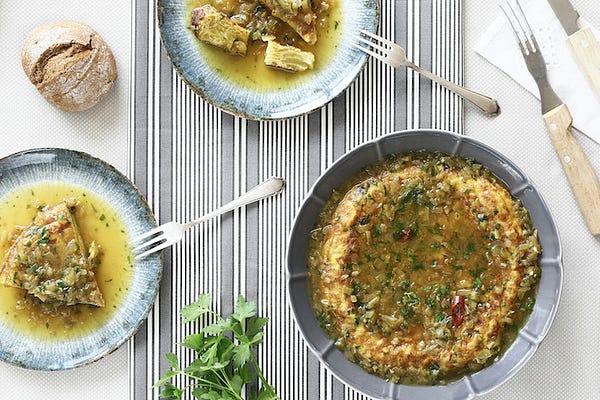 Otra manera de preparar la clásica tortilla de patata, bañada en un caldo con toques de azafrán.