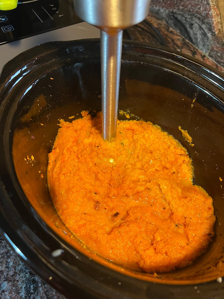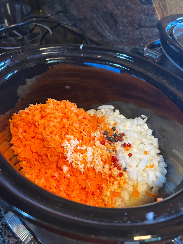 Pon 50 ml de aceite en slow cooker, añade las hortalizas picadas, varias bolas de pimienta –a tu gusto– y sal. Cocina durante 4 horas en ALTA. La zanahoria debe estar blanda.