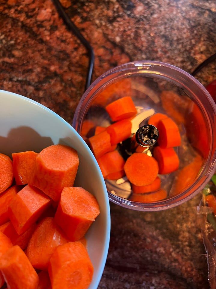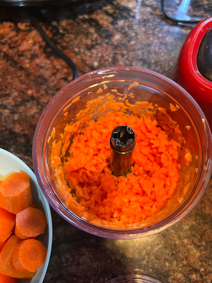Pela las zanahorias, córtalas en rodajas gruesas y pícalas en un robot de cocina.
