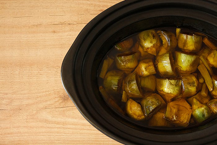 Hay recetas tan sencillas que apenas necesitan indicaciones. Los confitados son una de esas elaboraciones: solo hay que preparar el producto, sumergir en aceite –en el caso de confitados no dulces– y esperar a que se produzca la maravilla. Los slow cookers son estupendos para confitar verduras, carnes o pescados; su calor suave y gradual nos permite poder cocinar alimentos en aceite sin temor a que éste se queme y arruine la preparación.