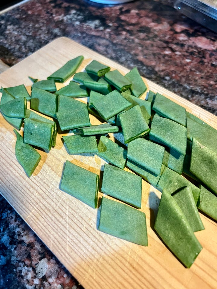 Elimina el pedúnculo de las judías verdes y córtalas al bies en trozos de 2 o 3 cm.