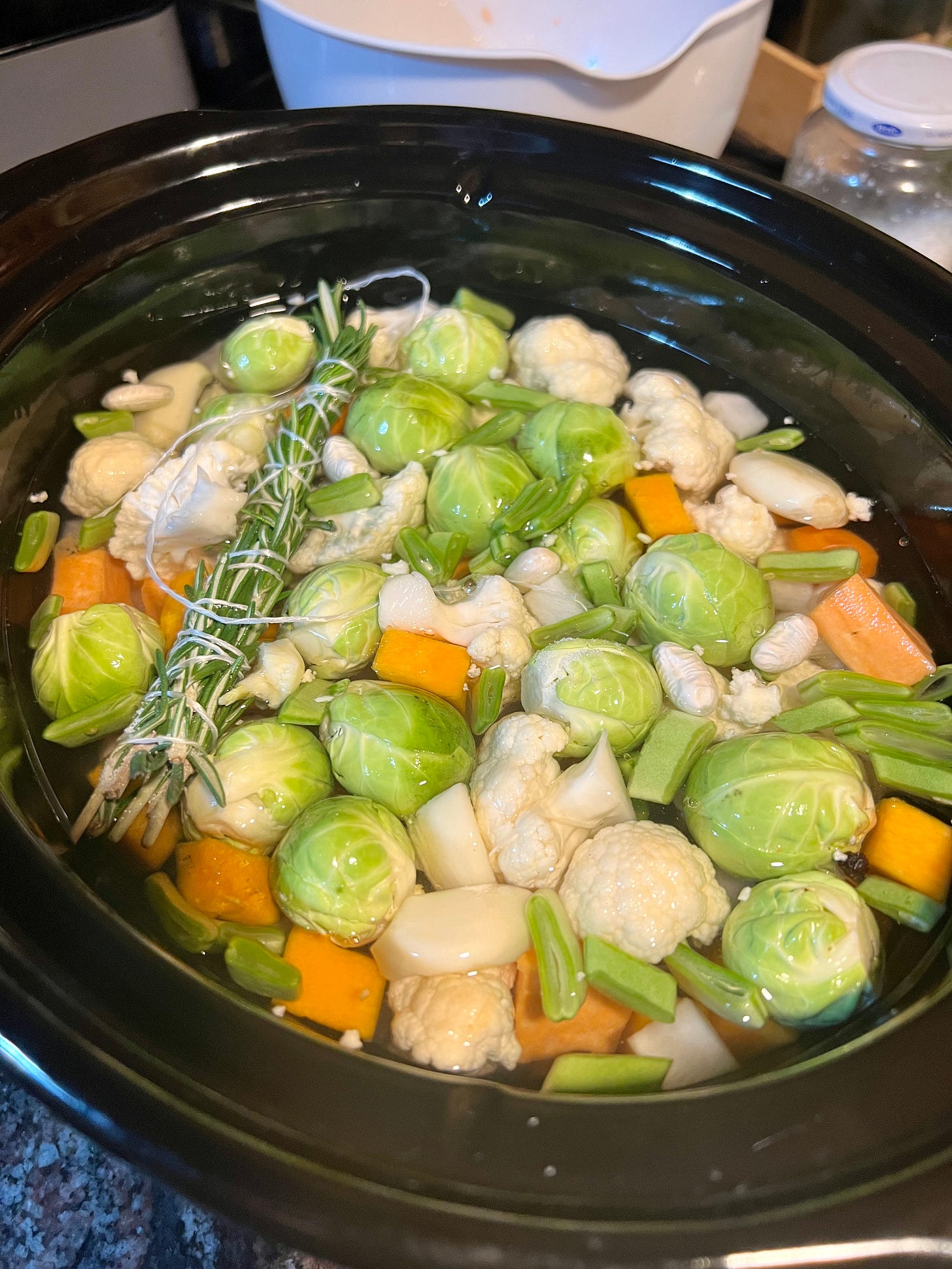 Da un golpe a los ajos hasta romperlos, quita la piel y ponlos enteros en el slow cooker con las alubias, las zanahorias, la calabaza y el romero atado con hilo de cocina2. Reserva el resto de hortalizas.