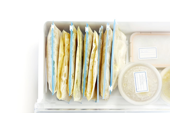 Aún no has terminado, queda congelar la bolsa para que quede plana como una carpeta (recuerda el archivador, no lo dejes escapar de tu mente). Necesitas tener libre un pequeño espacio donde pondrás la bolsa completamente cerrada y bien apañada para que, una vez congelada, quede uniforme. Pasadas varias horas puedes sacar la bolsa y archivarla en el cajón. Poco a poco, a medida que vayas haciendo esto con todo lo guardes, verás cómo tu congelador queda bien organizado y te resulta más fácil encontrar la crema de calabaza o el caldo de huesos.