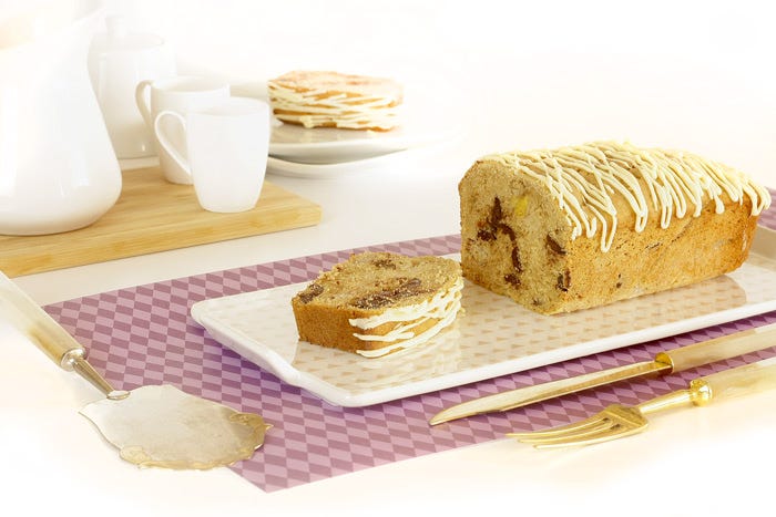 Puedes adornar el banana bread con una cobertura de chocolate blanco (opcional). Derrite el chocolate en gotas en el microondas o al baño María, añade la cucharada de mantequilla a temperatura ambiente y remueve hasta que se mezcle por completo.