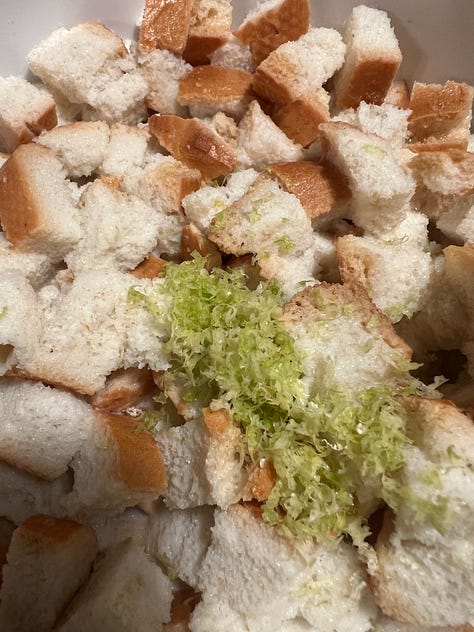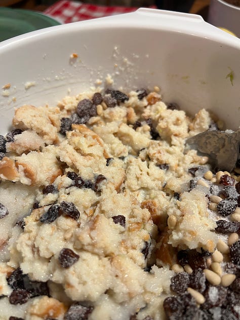 La receta no tiene mucho más comentario que hacer. Es una masa de pan reposado, hidratado con leche y huevos, y aromatizado con limón y pasas. Deliciosa y fácil de hacer.