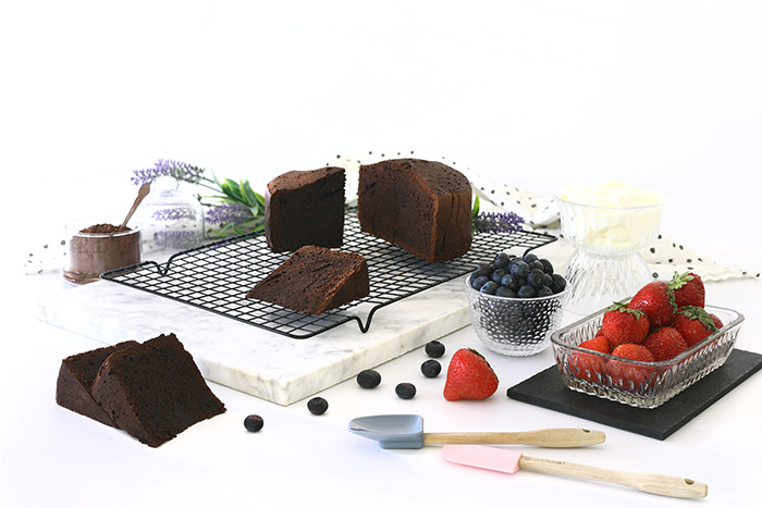 El chocolate negro de cobertura y el cacao puro le dan consistencia y un sabor profundo. Este bizcocho ligero es una excelente base para elaborar tartas y montar pasteles con distintas coberturas: frostings de queso, cremas de mantequilla y azúcar, mousse de chocolate, nata montada, ganache de chocolate, glasa real, merengue o fondant.