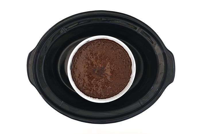 Vierte la mezcla en el molde, colócalo en el slow cooker, pon un paño sobre el recipiente y coloca la tapa encima, ajustando los extremos del paño para que quede tenso.
