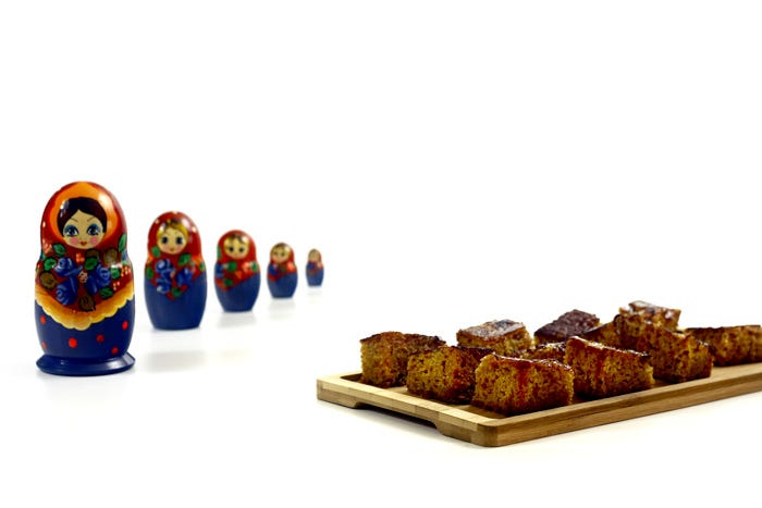 Que si uno quiere de chocolate, el otro del duro, que a la abuela la gusta el de yema y yo cuelo el de kikos y escamas de sal como me llamo Marta. Y así pasa lo que pasa. Después de la grande bouffe, recurrimos al truco de irlos apiñando en bandejas y platos cada vez más pequeños, como en un juego de muñecas rusas, pero los puñeteros no se acaban nunca.