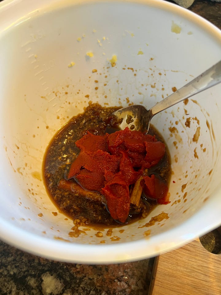 Mezcla los ajos, la salsa de soja, el vinagre, el azúcar o la miel, el tomate, los anises, la canela y el jengibre. Si usas miel o melaza, insiste hasta que se disuelva del todo.