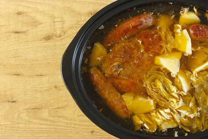 Coloca el botillo, los chorizos, las patatas y el repollo en el slow cooker y cubre con agua. Añade un poco de sal, solo un poco, ten en cuenta que el botillo y el chorizo llevan sal.