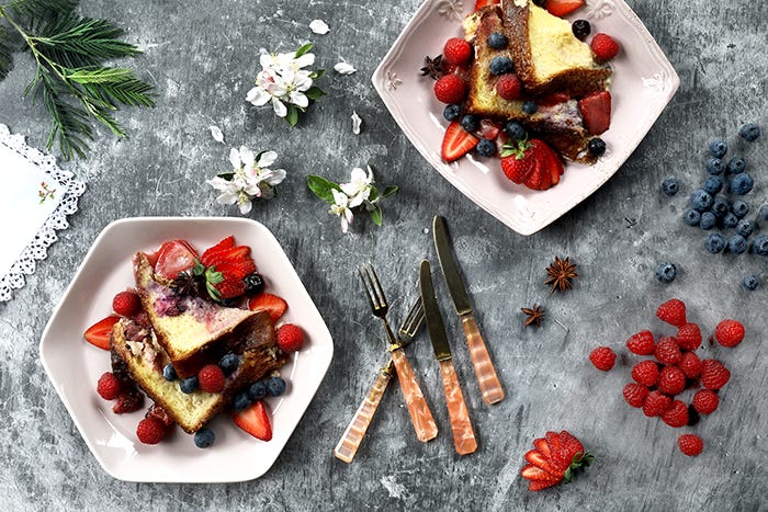 Emplata cada ración esparciendo el resto de las fresas y arándanos crudos y las frambuesas sobre el pudin de pan.