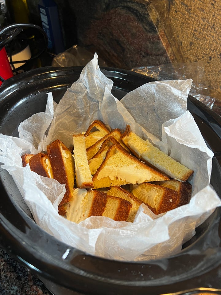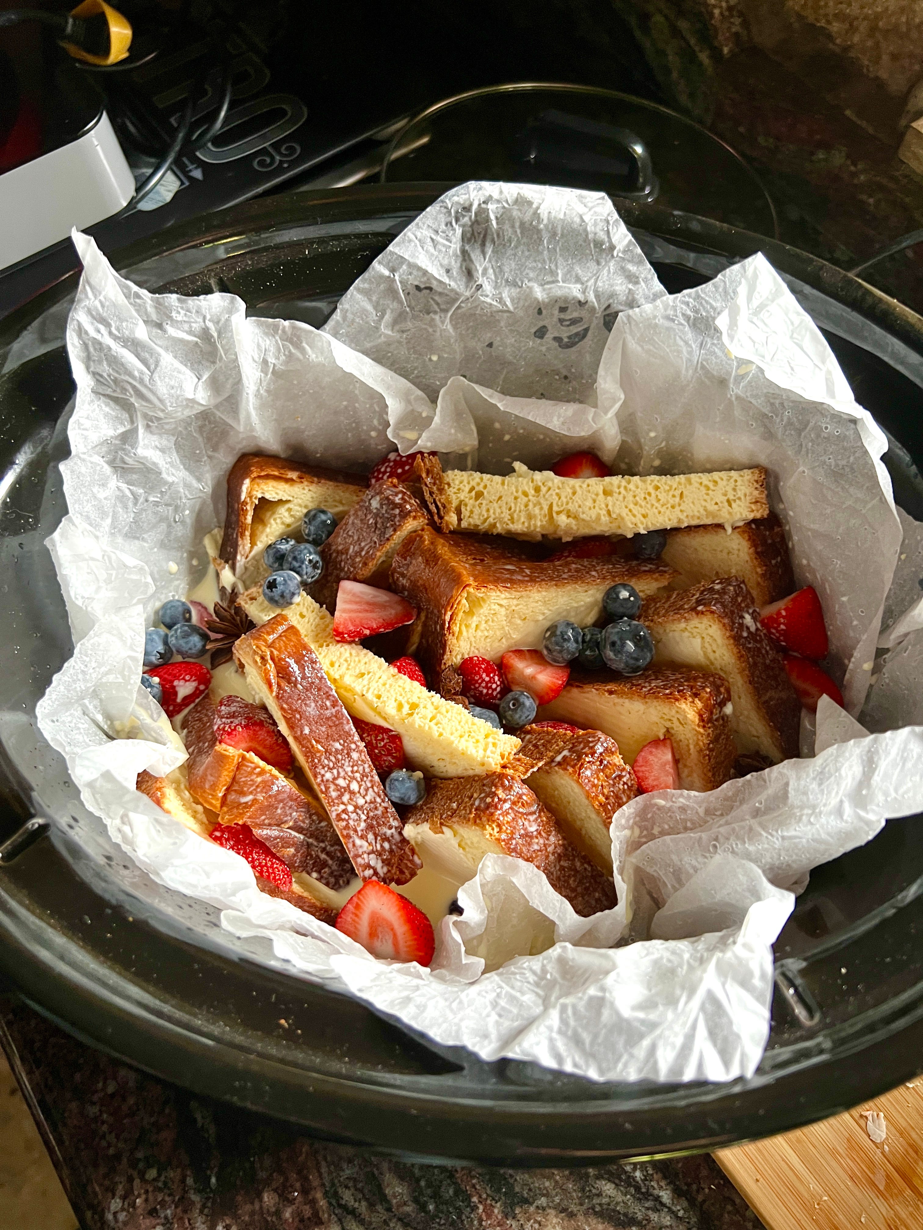 Cubre el fondo del recipiente del slow cooker con papel de horno. Coloca el pan encima poniendo la mitad de las fresas y los arándanos entre cada rebanada. Reserva el resto para después.