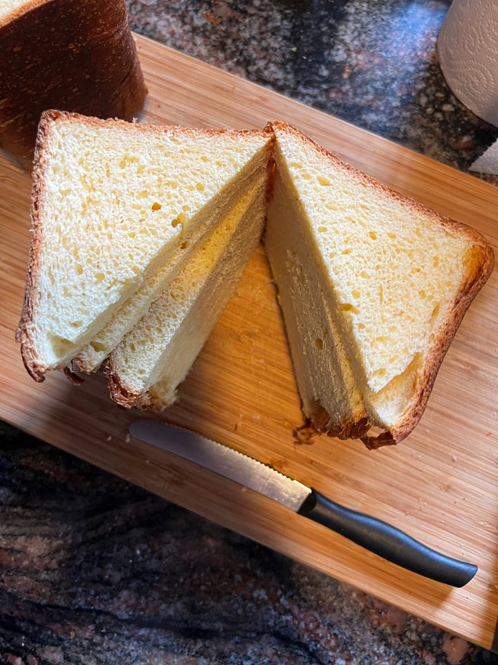 El pan no debe estar duro; cuanto más seco, más costará hidratarlo con la mezcla de leche y huevo, y queremos que se empape y ablande. Puede ser del día anterior. Mi brioche no estaba recién hecho. Lo compré un viernes y lo usé un martes, conservado en el frigo dentro de una bolsa de plástico. El punto adecuado es que no esté tiernísimo, porque se desharía, ni como una piedra: firme y con un punto de humedad.