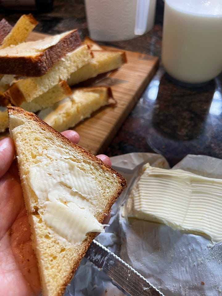 Corta el pan en rebanadas gruesas y úntalas con mantequilla por los dos lados. Para acomodarlos mejor, puedes cortarlos en triángulos si el pan es de molde.