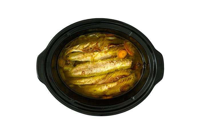 Saca los lomos y colócalos en el escabeche caliente. Pon la tapa, apaga el slow cooker, saca el recipiente de la carcasa y deja que se enfríe.