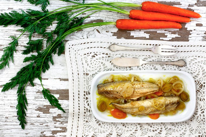 La caballa, también conocida como macarela o xarda, es un pescado azul muy parecido al verdel. En el mercado se encuentra a un precio muy bajo y resulta muy jugosa si se cuida la cocción. Como verás, a este escabeche le he añadido hinojo –que le da un toque anisado– y puerro, pero puedes incorporar otras verduras que te gusten o simplemente hacerlo con cebolla y zanahoria.