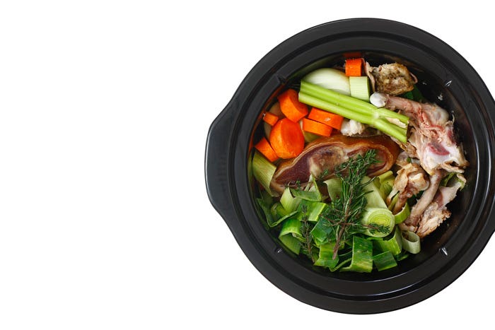 ¿Cuántas veces he dicho que los caldos hechos en crock pot son una maravilla? Ya he perdido la cuenta, pero es que esta es una de las elaboraciones en las que más se deja sentir la diferencia ante la cocina convencional. El tiempo y la cocción suave son fundamentales para extraer toda la sustancia y el sabor de hortalizas, carnes y huesos, y esa es la diferencia entre un caldo hecho en un rato en una olla exprés –que suelen ser blancos y de sabor poco complejo– a uno elaborado en slow cooker.