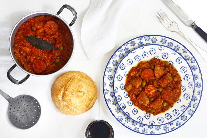Hace unos meses pasé un día entero en Toledo, con su pausa para comer incluida. Estaba sola y callejeé buscando dónde comer. Creo que pude hacer una mejor elección, la comida era pichí pachá, un poco mediocrilla, pero –todo tiene siempre un sentido– me sirvió para descubrir las carcamusas, un plato toledano de carne con tomate que prometía grandes resultados en cocción lenta.