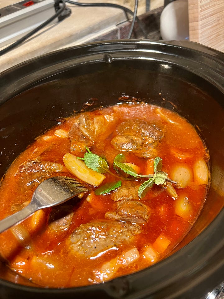 Cuando el guiso esté listo, la carne y las hortalizas habrán soltado su jugo y formado un salsa. Añade unas ramas de menta y mueve el slow cooker para que se mezcle todo bien.