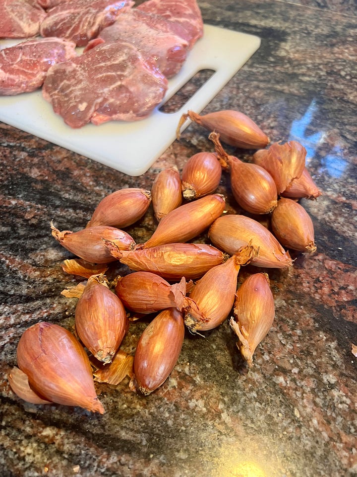 Las chalotas –que van enteras– se pueden sustituir por cebollitas francesas. Ya sabes, esas pequeñas que se venden en redes rojas. Aunque es más fácil encontrar chalotas del calibre adecuado que cebollitas, que, o son demasiado grandes o, si son pequeñas son más complicadas de pelar. Las chalotas se pelan bien, tienen un sabor agradable, son finas y se deshacen en la boca.