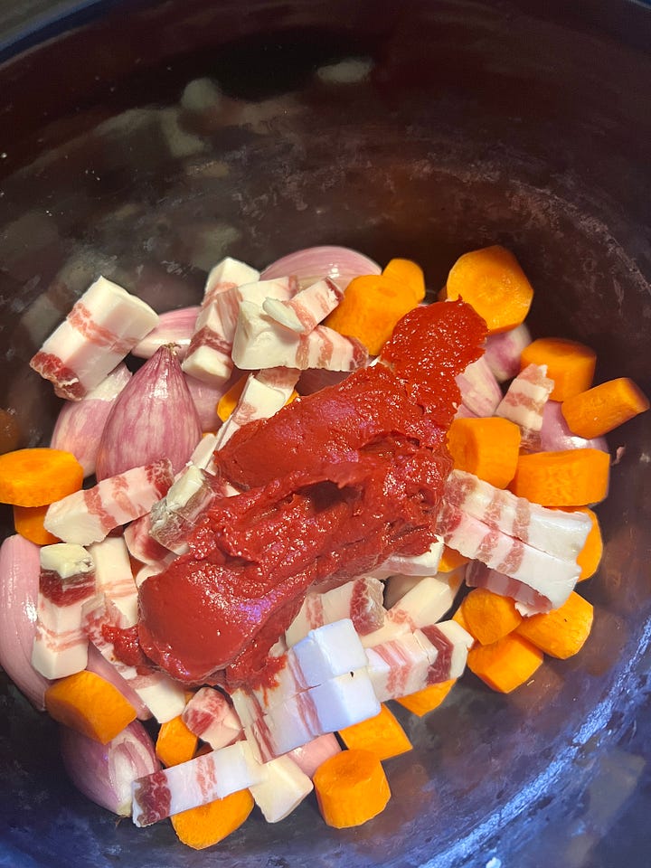 Coloca las chalotas, las zanahorias, la panceta y el tomate concentrado en el slow cooker.