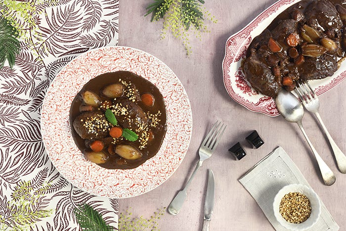 En los dos casos, estas carrilleras en salsa de chocolate te darán mucha felicidad. Es un plato en el que no tienes que estar picando hortalizas como si tuvieras un Cordon Bleu. Basta con pelar unas chalotas, trocear unas zanahorias y una panceta curada, salpimentar las carrilleras, y a tirar millas.