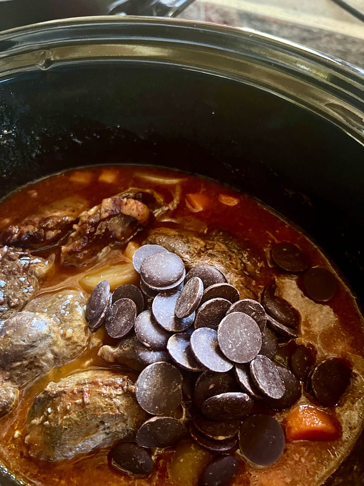 Añade el chocolate al guiso de manera gradual para poder probar y ajustar la intensidad a tu paladar. Yo puse la totalidad del chocolate –125 g– y resultó una salsa muy potente. Empieza añadiendo 75 g y prueba. Ve añadiendo tandas de 25 g hasta que esté a tu gusto. Descubre cuál es la proporción que más te gusta probando y ajustando.