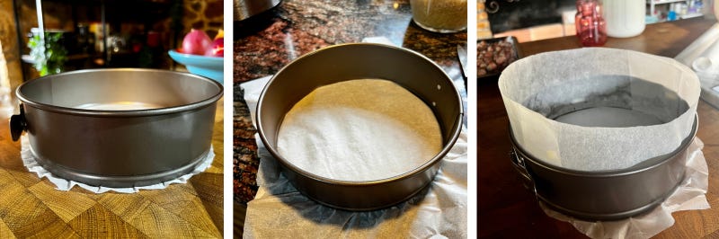 Forra la base del molde desmontable con papel de horno, encájalo en la ranura y pon el cierre de manera que el papel quede sujeto. Recorta parte del sobrante que salga por los lados.