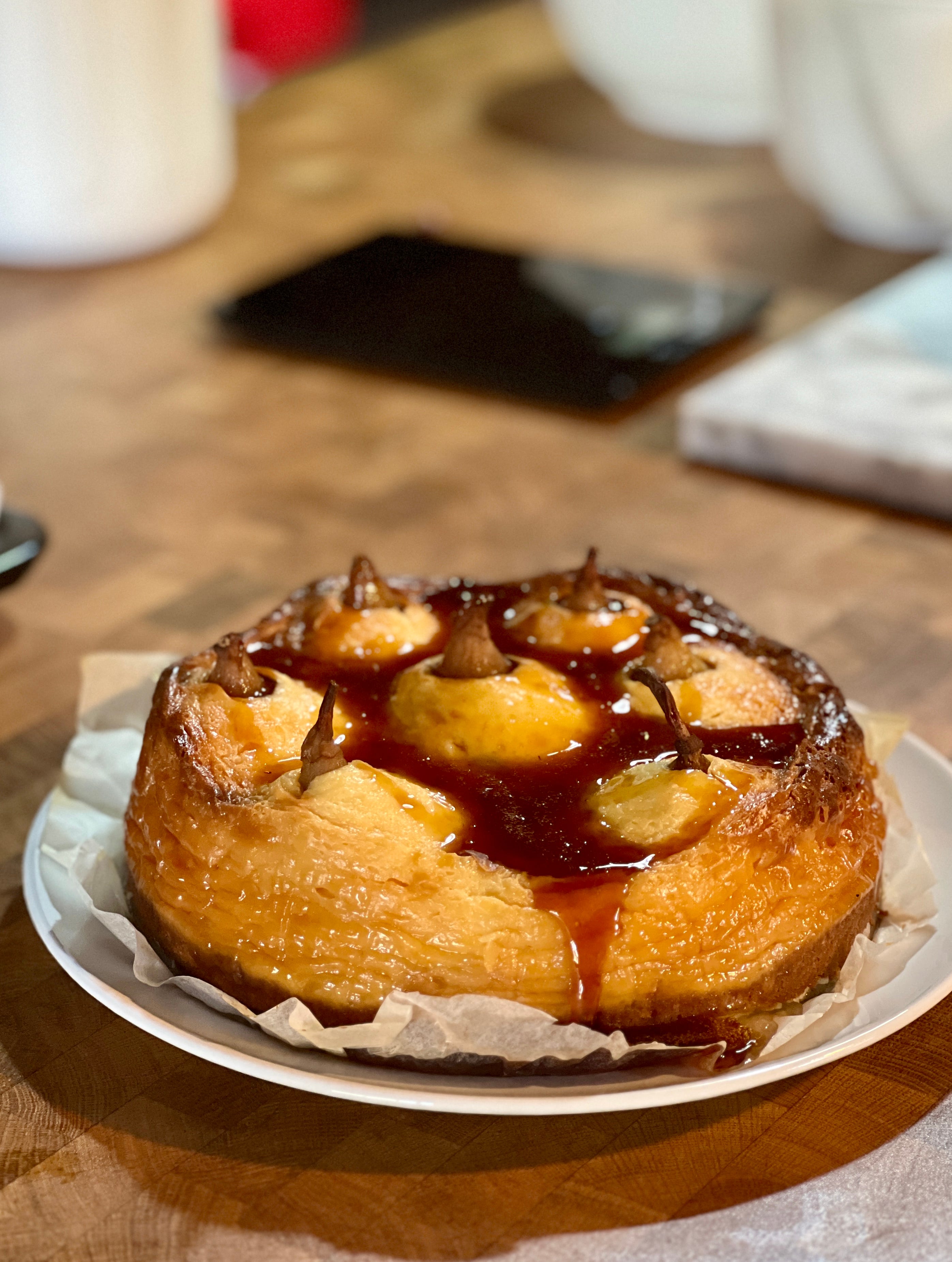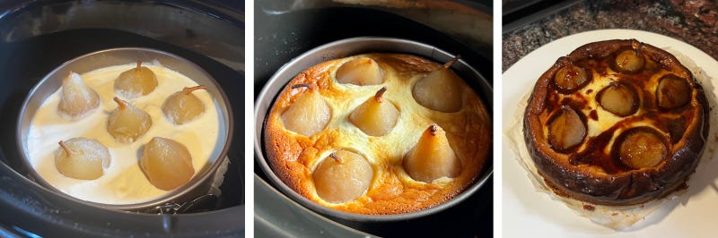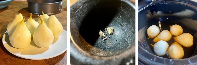 Para cocinar esta tarta recomiendo usar dos slow cookers diferentes: uno de entre 2,4 y 3,5 litros para confitar las peras, y uno de entre 6,5 y 8 litros para cocinar la tarta.