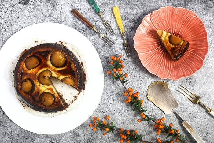Peras y queso saben a beso... Espera, que eran las uvas, pero este dicho le va muy bien a esta tarta de queso y peras confitadas endulzada con su propio sirope.