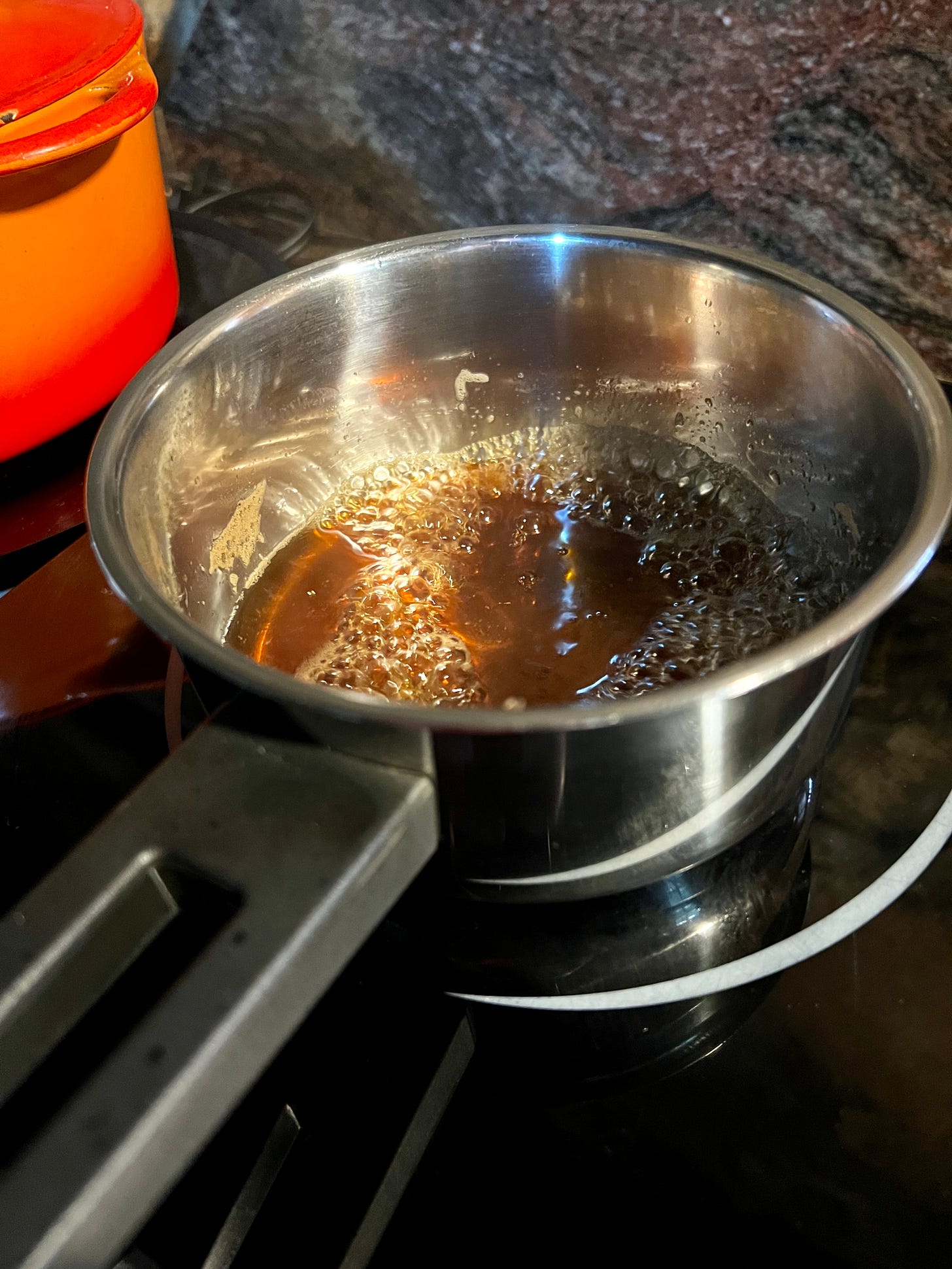 Pon el sirope en un cazo mientras se cocina la tarta. Cocina a fuego medio/fuerte hasta que se reduzca y se convierta en un sirope de caramelo espeso.