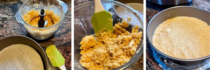 Tritura las galletas con la mantequilla ligeramente fundida en un robot de cocina hasta que se forme una masa homogénea y apelmazada.