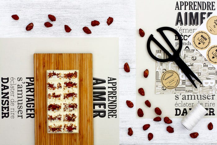 El truco y lo importante en esta receta, es atemperar bien el chocolate, para que la tableta salga con brillo y quede tan aparente como para regalarla con un envoltorio bonito y mucho cariño. Puedes hacer esta tableta de chocolate blanco con almendras garrapiñadas usando un molde para tableta de chocolate, que suelen ser de silicona, con acabado brillante y fácil desmoldado. Si no tienes molde, no te preocupes, puedes seguir el consejo de la sección de recomendaciones –más abajo– para conseguir una tableta menos pulida pero muy original y vistosa. ¡A chocolatear!