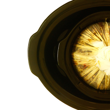 Coloca el molde en el recipiente de la crock pot. Vierte agua en el fondo del slow cooker para formar un baño María (dos o tres dedos). Tapa y cocina durante 8 horas en BAJA.