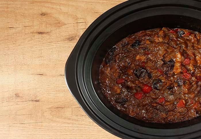Durante la última hora de cocción cocinamos el chutney a olla destapada para que el líquido se vaya evaporando y quede con una textura cremosa aunque con trozos enteros. Hay que remover de vez en cuando para que el chutney no se quede pegado en los lados de la olla, que es de donde viene el calor.