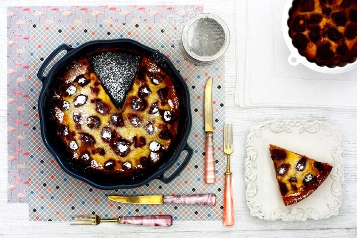 Tiene un nombre sonoro, de esos que hay que armarse de aplomo para pronunciar; dile a tu cuñado que has hecho un clafoutis y ya verás qué cara pone, –¿Clafoqué? –Pues clafoutis, del occitano clafotis, del verbo clafir, que quiere decir rellenar–. Y lo dejarás muerto, con una cereza en la boca y el tenedor en el aire. Clafoutises hay muchos pero solo uno es el de verdad.