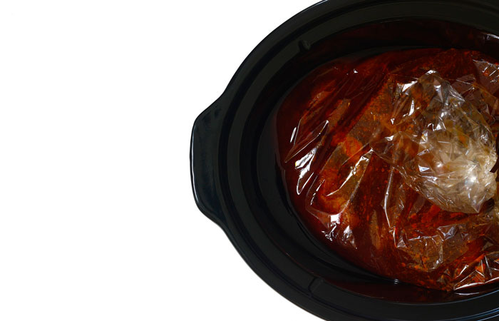 Pasa la carne con la marinada a una bolsa de asar. Cierra la bolsa y colócala en el recipiente del slow cooker. Pon la tapa y cocina durante 5 horas en BAJA si es aguja o cabecero de lomo. Si usas paleta de cerdo, aumenta la cocción a 7-8 horas en BAJA.Comprueba la cocción abriendo la bolsa con cuidado, si la carne se desmiga bien, está hecha.