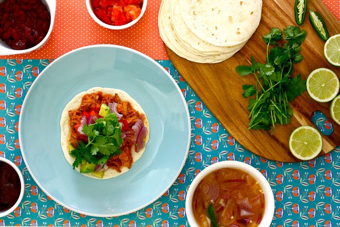 Prepara la mesa colocando la carne y cada uno de los acompañantes recomendados en cuencos. Calienta las tortillas en el microondas y cúbrelas con un paño. Deja que cada comensal se monte su plato sirviéndose las tortillas y la carne con los acompañamientos.
