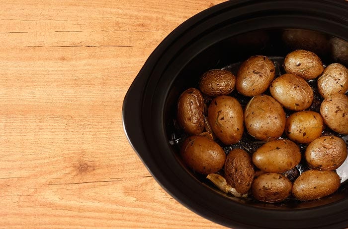 Tienes casi todo el menú listo en la libreta. Los entrantes, el primero, el principal y los postres, pero ya no te queda cabeza para pensar ni sitio en el fogón para una guarnición decente. Las patatas lo arreglan todo, te dices, y miras a tu crock pot pidiendo ayuda. –Si te planificas un poco y dejas un fuego libre durante unos minutos, yo me encargo del resto–, te dice tu olla lenta.