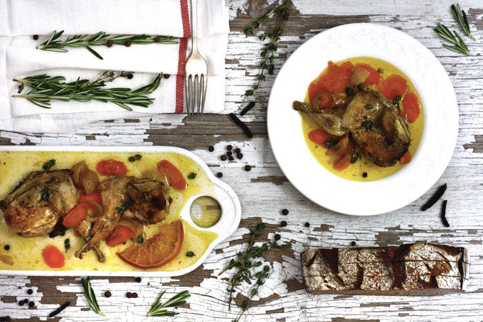 Coloca las codornices, las verduras, la naranja y la cabeza de ajos partida y salteada en el slow cooker. Añade el romero, el tomillo y la pimienta.