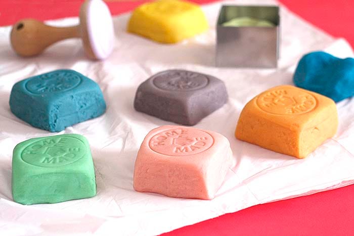 Puedes presentar la plastilina en bolas y guardarlas en botes individuales para que se conserven bien. También puedes darles forma cuadrada con la ayuda de un molde de cocina y marcarlos con un sello para galletas[ (como se ve en las imágenes). En este caso, envuelve cada taco en film plástico para evitar que se reseque.