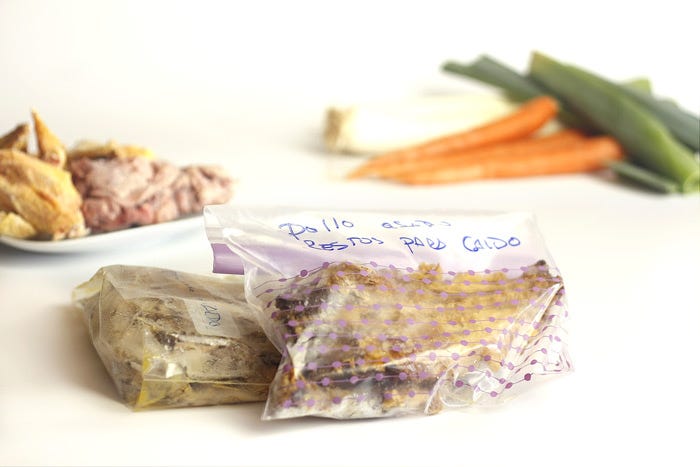 Conservar los caldos en el congelador puede ser una odisea si andamos cortos de espacio. Las tarteras o tápers no siempre optimizan el espacio. Por eso las bolsas con cierre de zip –que se pueden reutilizar con un buen lavado y secado– o las bolsas para envasar al vacío, son perfectas para organizar los cajones o baldas del congelador.