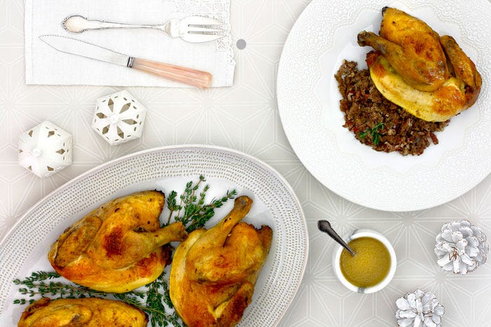 Los coquelets son pollitos con un peso entre 500 y 600 gramos, perfectos para hacer dos raciones por pieza. Son ricos, tiernos y con una presentación excelente, por eso me gustan para mesas festivas, acompañados con una salsa y una guarnición o un relleno, como en este caso.