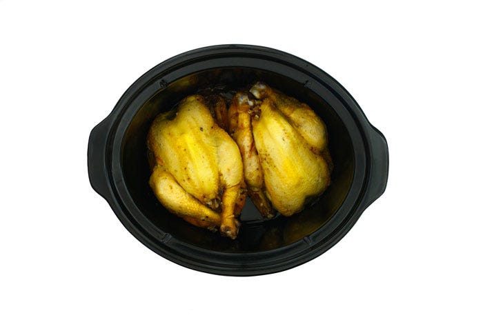 Pincela los pollitos con aceite de oliva, espolvorea con sal y pimienta, y colócalos en el slow cooker.