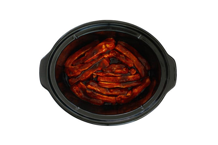 Coloca las costillas en el recipiente de la olla lenta y cocina entre 7 y 8 horas en BAJA o entre 3 y 4 en ALTA. Los tiempos son orientativos y dependen de la potencia de cada aparato.