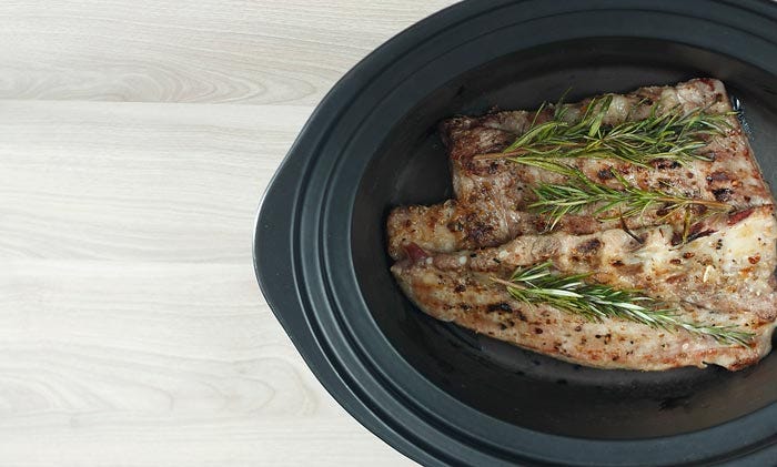 Coloca una vaporera extensible en el slow cooker para que la carne no toque el fondo.