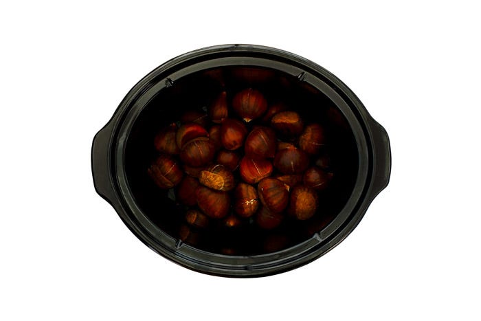 Pon las castañas en el slow cooker y cúbrelas con agua. Cocínalas durante 3 horas en ALTA o hasta que estén cocidas.