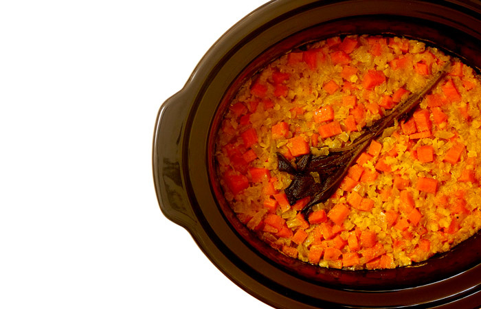 Coloca las lentejas, la batata y la cebolla en la olla. Cubre con agua 3 dedos por encima de los sólidos. Añade el jengibre, el curry y un poco de sal.