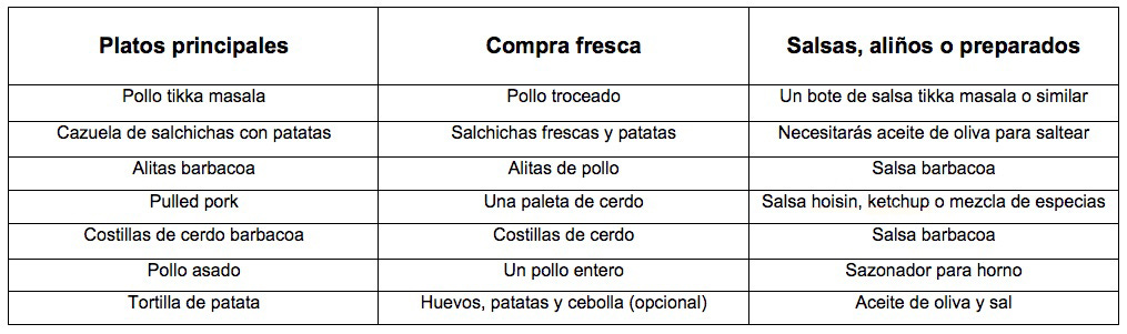 Para que te orientes mejor, aquí tienes una tabla con la compra necesaria para preparar siete platos principales que puedes complementar con ensaladas o sopas frías. Al utilizar salsas y preparados, atajas y ganas tiempo para playa, piscina, monte o lectura. Tú eliges.