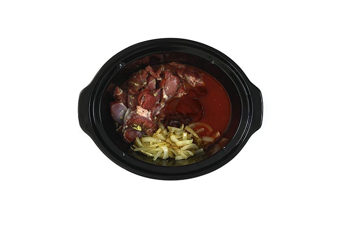 Trocea los tomates pera y ponlos en el slow cooker con la carne, el tomate concentrado, la cebolla y la pasta de curry, y mezcla.